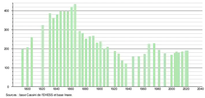 | L'évolution du nombre d'habitants est connue à travers les recensements de la population effectués dans la commune depuis 1793. Pour les communes de moins de 10 000 habitants, une enquête de recensement portant sur toute la population est réalisée tous les cinq ans, les populations légales des années intermédiaires étant quant à elles estimées par interpolation ou extrapolation[42]. Pour la commune, le premier recensement exhaustif entrant dans le cadre du nouveau dispositif a été réalisé en 2004[43]. En 2021, la commune comptait 191 habitants[Note 7], en augmentation de 2,69 % par rapport à 2015 (Haute-Garonne : +7,43 %, France hors Mayotte : +1,84 %). |