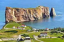 L'extrémité est de la péninsule gaspésienne est ancrée dans l'imaginaire populaire grâce à l'imposant rocher Percé et à l'île Bonaventure, devenus depuis un parc national, de même qu'à la croix plantée par Jacques Cartier en 1534 lors de sa revendication du territoire au nom de François Ier. Au sud de la Gaspésie se trouve la Baie des Chaleurs, un nom invitant qui rappelle que l'on peut s'y baigner en été en tout confort. Elle appartient par ailleurs au très sélect Club des plus belles baies du monde[17]. Toujours sur son flanc sud, la péninsule gaspésienne est reconnue mondialement par l'UNESCO pour l'importance de son patrimoine fossile[18] : le parc national de Miguasha propose aux visiteurs animation et vulgarisation scientifiques .