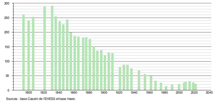 L'évolution du nombre d'habitants est connue à travers les recensements de la population effectués dans la commune depuis 1793. Pour les communes de moins de 10 000 habitants, une enquête de recensement portant sur toute la population est réalisée tous les cinq ans, les populations légales des années intermédiaires étant quant à elles estimées par interpolation ou extrapolation[19]. Pour la commune, le premier recensement exhaustif entrant dans le cadre du nouveau dispositif a été réalisé en 2008[20].