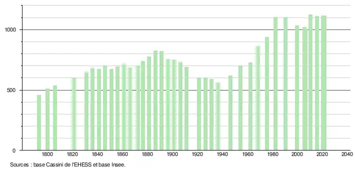 L'évolution du nombre d'habitants est connue à travers les recensements de la population effectués dans la commune depuis 1793. Pour les communes de moins de 10 000 habitants, une enquête de recensement portant sur toute la population est réalisée tous les cinq ans, les populations légales des années intermédiaires étant quant à elles estimées par interpolation ou extrapolation[18]. Pour la commune, le premier recensement exhaustif entrant dans le cadre du nouveau dispositif a été réalisé en 2005[19].