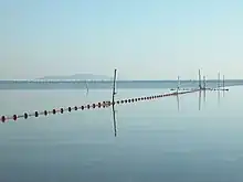 L'étang de Thau depuis une plage de Mèze. Sète est sur la ligne d'horizon. Janvier 2022.