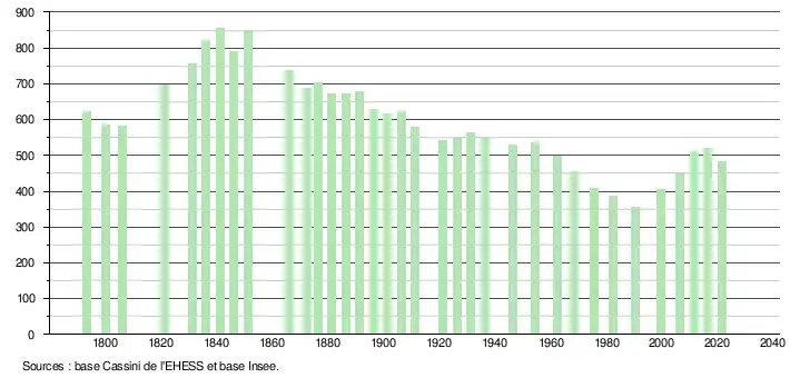 L'évolution du nombre d'habitants est connue à travers les recensements de la population effectués dans la commune depuis 1793. Pour les communes de moins de 10 000 habitants, une enquête de recensement portant sur toute la population est réalisée tous les cinq ans, les populations légales des années intermédiaires étant quant à elles estimées par interpolation ou extrapolation[20]. Pour la commune, le premier recensement exhaustif entrant dans le cadre du nouveau dispositif a été réalisé en 2006[21].
