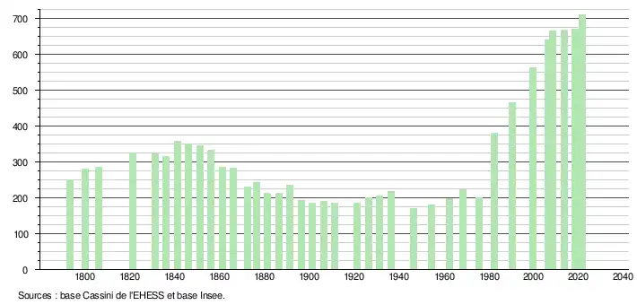 L'évolution du nombre d'habitants est connue à travers les recensements de la population effectués dans la commune depuis 1793. Pour les communes de moins de 10 000 habitants, une enquête de recensement portant sur toute la population est réalisée tous les cinq ans, les populations légales des années intermédiaires étant quant à elles estimées par interpolation ou extrapolation[21]. Pour la commune, le premier recensement exhaustif entrant dans le cadre du nouveau dispositif a été réalisé en 2008[22].