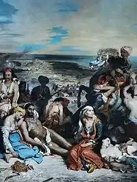 Avec la scène des massacres de Scio, que Delacroix présente en 1824 au Salon Officiel, comme avec La Grèce sur les ruines de Missolonghi deux ans plus tard, Delacroix participe au mouvement philhellène. Il obtient la médaille de seconde classe et l’État l'achète 6 000 francs, pour l'exposer ensuite au musée du Luxembourg[61]. La toile s’inspire d’un fait d’actualité : le massacre de la population de l’Île de Chio par les Turcs, survenu en avril 1822. Dès cette date, Delacroix a l’idée de peindre un tableau sur ce thème qu’il abandonne au profit de La Barque de Dante[62]. Il a trouvé son sujet dans l’ouvrage Mémoires du colonel Voutier sur la guerre actuelle des Grecs[63]. Le lundi 12 janvier 1824, il déjeune avec le colonel et note dans son journal : « C’est donc proprement aujourd’hui [...] que je commence mon tableau »[64].