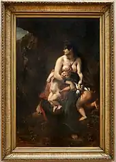 - La Vierge du Sacré-Cœur (1821, musée Eugène Delacroix), rappelle Michel-Ange par l’aspect massif et statique de la figure de la Vierge. Le ministère de l'Intérieur avait commandé ce retable pour la cathédrale Saint-Pierre de Nantes à Géricault, qui, peu intéressé par le sujet, le sous-traita à Delacroix qui avait des besoins pressants d’argent. Batissier révélera la substitution en 1842 dans la Revue du XIXe siècle[44].