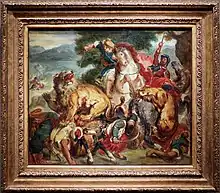 Théodore Géricault a influencé considérablement Delacroix, particulièrement au début de sa carrière[53]. Il lui emprunte sa manière : de forts contrastes d’ombres et de lumières donnant du relief et du modelé. Il utilise également certaines de ses couleurs : des vermillons, du bleu de Prusse, des bruns, des blancs colorés. L’officier turc enlevant sur son cheval l’esclave grecque de la Scène des massacres de Scio (1824, musée du Louvre) s'inspire de l'Officier de chasseurs à cheval de Géricault] (1812, musée du Louvre)[54]. Quand celui-ci meurt le 26 janvier 1824, Delacroix devient malgré lui le chef de file du Romantisme[55].