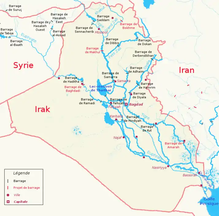 - le canal Thartar-Euphrate, qui permet le déversement des crues du Tigre dans l'Euphrate via le lac-réservoir du Thartar ;