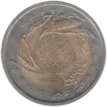 - pièce de 2 euros : L'effigie de l'homme de lettres et homme politique florentin Dante Alighieri, d'après Raphaël, extrait de la fresque La Dispute du Saint-Sacrement[5]. À gauche, la mention du pays émetteur représenté par les lettres R et I superposées, avec juste en dessous le millésime. Le tout est entouré des 12 étoiles du drapeau européen, sur l'anneau extérieur. La gravure a été réalisée par Maria Carmela Colaneri.
