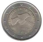 |  | Le logo du 150e anniversaire de l'unification de l'Italie composé de trois drapeaux italiens qui flottent pour illustrer les trois derniers jubilés (1911, 1961 et 2011). En haut apparaît l'inscription 150o DELL’UNITA’ D’ITALIA (150e anniversaire de l'unification de l'Italie). À droite, les initiales du pays émetteur RI (pour Repubblica Italiana). En bas, les années 1861 › 2011 › › . L'anneau externe de la pièce comporte les douze étoiles du drapeau européen. | ||||||