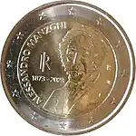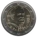 |  | L'effigie de Giovanni Pascoli, la tête légèrement tournée vers la droite, au-dessus de son nom G. PASCOLI. À sa gauche, l'année de sa mort 1912. À sa droite, le millésime 2012 et les initiales du pays émetteur RI (pour Repubblica Italiana). L'anneau extérieur de la pièce représente les douze étoiles du drapeau européen. | ||||||