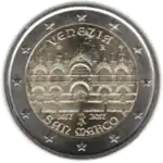 |  | Façade de la Basilique Saint-Marc de Venise. En haut, le nom de la ville VENEZIA (Venise). En bas, le nom de la basilique SAN MARCO (Saint-Marc) en dessous des initiales superposées du pays émetteur RI (pour Repubblica Italiana) entourées des années 1617 et 2017. L'anneau externe de la pièce comporte les douze étoiles du drapeau européen. | ||||||