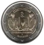 |  | Signature de la Constitution montrant Enrico De Nicola, Président de la République à titre provisoire, assis au bureau, entouré, à gauche d'Alcide De Gasperi, Président du Conseil et, à droite, de Umberto Terracini, Président de l'Assemblée constituante de la République italienne. En haut, la légende COSTITUZIONE (Constitution), au-dessus des initiales superposées du pays émetteur RI (pour Repubblica Italiana). En bas, la légende CON SICURA COSCIENZA (en bonne conscience) et les années 1948·2018. L'anneau externe de la pièce comporte les douze étoiles du drapeau européen. | ||||||