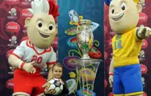 Le mardi , les mascottes officielles de la compétition sont dévoilées au public, à Varsovie. Portant les couleurs des deux pays, elles sont assez semblables à celles de 2008, créées elles aussi par Warner Bros[37]. Le lendemain, elles font leurs premières sorties dans un stade, avant le match amical de la Pologne contre la Côte d'Ivoire à Poznań, et celui de l'Ukraine contre la Suisse à Genève[38]. Pas encore nommées, l'UEFA fait participer pour la seconde fois les internautes, qui ont le choix entre trois duos de noms, et peuvent voter jusqu'au 3 décembre[37]. Le lendemain, à Kiev, l'instance européenne dévoile les résultats du vote, réalisé auprès de 39 233 personnes, et qui plébiscite le duo Slavek – Slavko[39],[40].