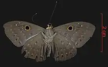 Eurybia cyclopia est de taille moyenne avec une envergure d'environ 38 mm pour les mâles et d'environ 40 mm pour les femelles[3]. Le dessus est de couleur marron clair avec aux antérieures un gros ocelle centré de noir et une ligne submarginale d'ocelles centrés de foncé, et aux postérieures la même ligne submarginale d'ocelles centrés de noir sur une large bande jaune cuivré.