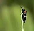 D'une longueur de 4 à 7 mm, son corps est noir, à l'exception du thorax rouge clair (pronotum, mésonotum, métapleures et tegulae), et des genoux blanchâtres[1].