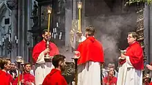 Dans le catholicisme de rite latin, l'évangéliaire est le livre liturgique destiné au ministre de la proclamation solennelle de l'évangile, en principe le diacre ou, à défaut, le prêtre[2]. Il est distingué du missel et l'épistolier. Dans le rite romain ordinaire, toutes les péricopes bibliques sont généralement réunies dans un seul livre le lectionnaire.
