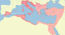 Après la chute de son homologue occidental en 476, l'Empire romain d'Orient reste debout malgré les attaques des « Barbares » et des Perses sassanides. Entre 533 et 553, l'empereur Justinien Ier tente de reprendre les territoires perdus, envoyant son général Bélisaire à la reconquête de l'Afrique du Nord, de l'Italie, de la Dalmatie et du sud de l'Hispanie.