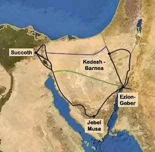 Après leur départ d’Égypte, les Israélites réalisèrent un périple à travers environ quarante endroits. Les endroits où l’on situe actuellement ces étapes, surtout les premières de la liste, sont inconnues ou sujettes à caution. Des événements d’importance se tinrent dans ces premières 'stations', dont le don ou la proclamation des Dix Commandements sur le mont Sinaï, avec le reste de la Loi mosaïque. Les Israélites arrivent finalement à Kadesh-Barnéa, où ils demeurent relativement longtemps. Des explorateurs sont envoyés faire un rapport sur Canaan en vue de son invasion mais, à l’exception de Josué fils de Noun l’Éphraïmite et Caleb fils de Yefouné le Qenizzite, tous dissuadent de tenter la moindre entreprise devant la force des habitants.