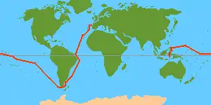 La flotte navigua au sud-ouest vers les Canaries, puis au sud en longeant la côte africaine[3]. En novembre, de Loaísa manœuvra pour traverser l'Atlantique pour rejoindre le Brésil, atteignant les côtes de Patagonie en janvier 1526[3]. Il ne fut pas trouvé de traces de la Trinidad, et de Loaísa décida d'en abandonner la recherche pour continuer vers les Moluques. Cependant, les conditions météorologiques étaient peu favorables les semaines suivantes, avec de forts vents à l'entrée du détroit de Magellan, les navires eurent du mal à rester groupés. Deux navires firent naufrage, le Sancti Spiritus et l'Anunciada firent naufrage, et un autre, le San Gabriel, fut refoulé vers l''Atlantique et déserta l'expédition.