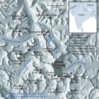 | En vert | Voie normale, itinéraire emprunté en 1922, camps hauts vers. 7700 et 8 300 m, aujourd'hui, le camp à 8 300 m est légèrement plus à l'ouest (marqué par 2 triangles) |
