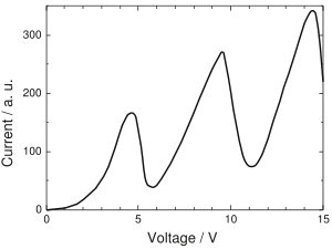 La courbe représentant le courant de l'anode en fonction de la tension aux bornes de la cathode, montre qu'il y a bien des pics d'absorption. L'énergie (et alors la vitesse) des électrons est représentée par le potentiel électrique que subissent les électrons. Cette courbe est de type pseudo-périodique de période 4,9 V et dont l'amplitude augmente en fonction de la tension d'extraction.