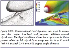 Dans son rapport d’enquête, le Columbia Accident Investigation Board (CAIB) note que les preuves photographiques permettent de conclure que le biseau en mousse isolante du trépied gauche est le débris ayant percuté la navette sur le bord d'attaque inférieur de l'aile gauche dans la région située entre les panneaux 6 à 9 avec une vitesse relative d'approximativement 877 km/h. L'absence de caméras haute résolution a gêné l'analyse de cette collision à l'issue de la phase de décollage. Néanmoins elles étaient suffisantes pour déterminer, au cours du vol, les conséquences sur le système de protection thermique de la navette[19].