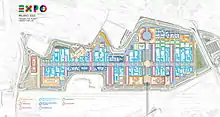 La zone choisie est de forme oblongue avec une longueur totale de près de 3 km. Cette forme a permis d'arriver rapidement à une conception autour d'un axe principal conçu comme un boulevard le long duquel les pavillons sont situés. La conception de piscines et les voies navigables dans et autour de la zone de l'Expo a été un élément de première importance au cours des trois phases.