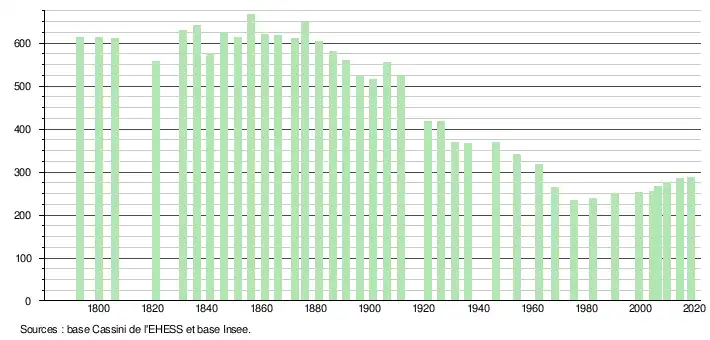 Oscillant entre 500 et 700 habitants depuis la Révolution (avec un maximum à 667 en 1856) jusqu'à la veille de la Première Guerre mondiale, la population de la commune a ensuite décru régulièrement pour atteindre son minimum en 1975 avec 234 habitants. Depuis, elle progresse lentement.