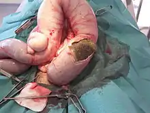 Plus rarement ; il se complique d'une ulcération muqueuse (Cf. érosion mécaniques au contact de fécalomes durcis) pouvant induire une occlusion ou sub-occlusion avec perforation puis péritonite[18] voire d'une nécrose des tissus (nécrose colique). Une ischémie peut résulter de la compression du fécalome notamment lors de longs efforts de défécation. Les capillaires sous-muqueux sont alors écrasés et des phénomènes ischémiques des proches parois de l'intestin peuvent survenir[19]. Plusieurs examens complémentaires peuvent aider à bien localiser la compression dans le cas d'un syndrome occlusif ou sub-occlusif ; le scanner abdominopelvien étant la référence (avec injection intraveineuse de produit de contraste iodé (PCI) recommandée, en tenant compte des contre-indications habituelles[20].