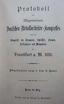 - Protokoll des Allgemeinen Deutschen Metallarbeiter-Kongresses und der Kongresse der Klempner, Schlosser, Former, Feilenhauer und Mechaniker zu Frankfurt a. M. 1891, Bund Verlag, Cologne, 1991, (ISBN 978-3-7663-2270-8)