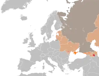 L'Empire russe poursuit, sous son règne et celui de ses successeurs, son expansion dans le Caucase et vers les bouches du Danube, au détriment de l'Empire perse et de l'Empire ottoman. La Géorgie (vassale de l'Empire perse) est annexée en 1813 (traité de Golestan). La partie orientale de la principauté de Moldavie (vassale de l'Empire ottoman) est annexée en 1812 et forme le gouvernement de Bessarabie (Traité de Bucarest de 1812). L'Arménie, le Daghestan et une partie de l'Azerbaïdjan sont annexés en 1828 au terme d'un conflit de quatre ans avec l'Empire perse (Traité de Turkmantchaï). Au décès d'Alexandre (1825), des officiers réformistes, les décembristes, se soulèvent en vain pour demander une réforme de la monarchie. Cette tentative de soulèvement d'officiers issus de l'aristocratie va servir aussi de modèle à de nombreux intellectuels russes au cours du siècle suivant, inspirés par la philosophie de Hegel ou de Kropotkine. En 1829 l'Empire russe se fait céder par l'Empire ottoman les Bouches du Danube. Nicolas Ier bénéficie d'une bonne croissance économique, mais renforce l'appareil répressif. Il écrase violemment un soulèvement armé de la Pologne (1831). Le déclin de l'Empire ottoman, qui attise les convoitises des puissances européennes, est à l'origine d'un conflit entre la Russie et les autres puissances européennes, Grande-Bretagne en tête: la guerre de Crimée. Défait à Sébastopol (1856), Alexandre II, le successeur de Nicolas, doit céder le sud de la Bessarabie avec les Bouches du Danube, et perd les droits de passage entre la mer Noire et la Méditerranée. Un dernier conflit victorieux avec l'Empire ottoman (1878), déclenché par l'insurrection bosniaque de 1876[27], lui permet de retrouver un accès au Danube et parachève la conquête du Caucase. Ce conflit inquiète cependant les investisseurs, car la Turquie refuse de signer le protocole élaboré à Londres par les grandes puissances.