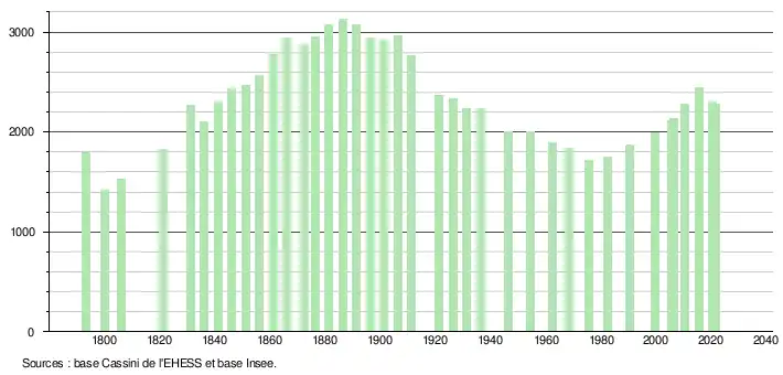L'évolution du nombre d'habitants est connue à travers les recensements de la population effectués dans la commune depuis 1793. Pour les communes de moins de 10 000 habitants, une enquête de recensement portant sur toute la population est réalisée tous les cinq ans, les populations légales des années intermédiaires étant quant à elles estimées par interpolation ou extrapolation[24]. Pour la commune, le premier recensement exhaustif entrant dans le cadre du nouveau dispositif a été réalisé en 2005[25].