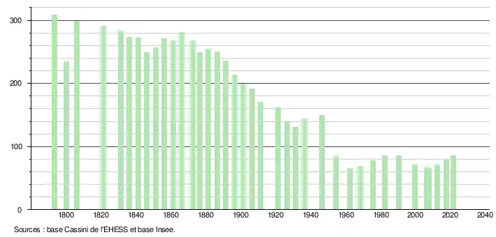 L'évolution du nombre d'habitants est connue à travers les recensements de la population effectués dans la commune depuis 1793. Pour les communes de moins de 10 000 habitants, une enquête de recensement portant sur toute la population est réalisée tous les cinq ans, les populations légales des années intermédiaires étant quant à elles estimées par interpolation ou extrapolation[18]. Pour la commune, le premier recensement exhaustif entrant dans le cadre du nouveau dispositif a été réalisé en 2007[19].