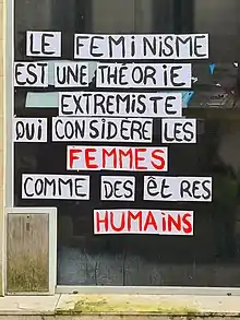 Le féminisme est un ensemble de mouvements et d'idées politiques, sociales et culturelles ayant pour objectif de promouvoir l'égalité entre les femmes et les hommes en militant pour les droits des femmes[1],[2], et ce, sur le principe fondamental que les hommes et les femmes sont égaux et doivent être considérés comme tels dans la société[3].