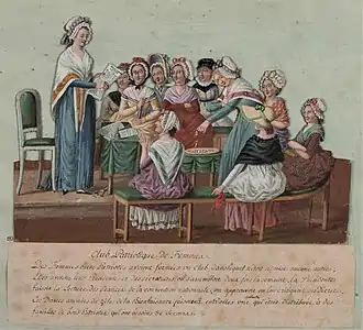 Elles n'en continuent pas moins à investir l'espace public, organisées en clubs mixtes ou féminins et en sociétés d’entraide et de bienfaisance, et participent avec passion à toutes les luttes politiques de l'époque. Parmi les personnalités féminines notoires des débuts de la Révolution, il faut retenir Olympe de Gouges qui publie en 1791 la Déclaration des droits de la femme et de la citoyenne : « La femme a le droit de monter sur l’échafaud ; elle doit avoir également celui de monter à la Tribune »[26].