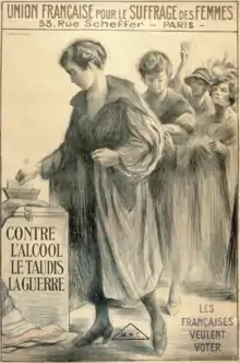 Le Conseil national des femmes françaises, fondé dans le sillage de la loi sur les associations de 1901, se veut apolitique et laïque. Ses militantes, issues principalement de la bourgeoisie, sont des républicaines, des socialistes ou des protestantes, initiées à l’action publique à travers les activités sociales et philanthropiques. L’Union française pour le suffrage des femmes fédère en 1909 les féministes favorables au droit de vote des femmes[58].