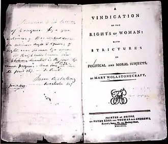 En 1792, une femme de lettres britannique, Mary Wollstonecraft fait paraître Vindication of the Rights of Woman, un ouvrage traduit en français la même année sous le titre Défense du droit des femmes. L'auteure, qui participe aux débats passionnés suscités outre-Manche par la Révolution en France, n'hésite pas à assimiler le mariage à une forme légale de prostitution. Elle oppose et rapproche l'exploitation dont sont victimes les femmes les plus pauvres, contraintes au travail salarié ou à la rémunération de leurs services sexuels, au sort des jeunes femmes de la petite et moyenne bourgeoisie, privées de toute perspective professionnelle par les préjugés et le défaut d'éducation, et réduites à chercher un « beau » parti.