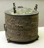 Gauche: Coupe à vin en jade avec des décorations en relief, période des Han occidentaux (202 av.J.-C - 9 apr. J.-C) Droite: Chauffe-vin en bronze décoré de reliefs représentant des animaux, datant de l'an 26, période des Han orientaux | ||