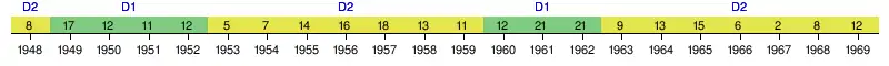 La frise suivante résume les classements successifs du club en championnat.