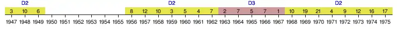 | 1957 | 2e Zone 3 | 12e | 21 | 30 | 8 | 5 | 17 | 26 | 47 | -21 | Deuxième tour Q |