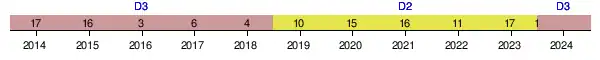 | 2018-2019 | 2e | 10e | 51 | 38 | 12 | 15 | 11 | 45 | 52 | -7 |  Danil Outkine | 10 |  Aleksandr Nagorny |