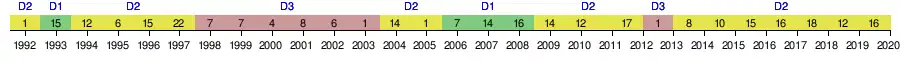 | 1994 | 2e | 12e | 41 | 42 | 15 | 11 | 16 | 44 | 53 | -9 | — |