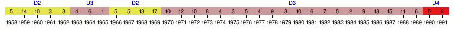 | 1959 | 2e Zone 7 | 14e | 11 | 26 | 5 | 1 | 20 | 25 | 50 | -25 | — |
