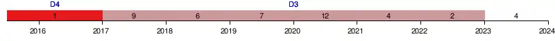 | 2023-2024 | 3e Or | 4e | 24 | 18 | 6 | 6 | 6 | 24 | 26 | -2 | 128es de finale |