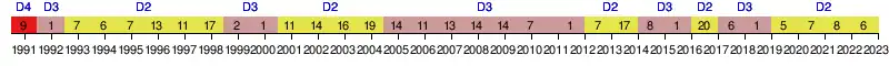| 1997 | 11e | 61 | 42 | 19 | 4 | 19 | 53 | 54 | -1 | 32es de finale | |