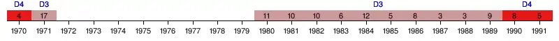 | 1971 | 3e Zone 6 | 17e | 35 | 38 | 7 | 14 | 17 | 30 | 54 | -24 | |