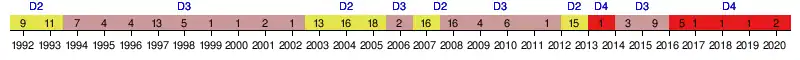 | 1995 | 3e Est | 4e | 66 | 34 | 21 | 3 | 10 | 77 | 37 | +40 | Deuxième tour |