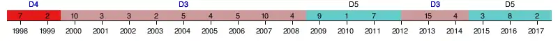 | 2004 | 5e | 55 | 32 | 15 | 10 | 7 | 55 | 29 | +26 | Deuxième tour | |