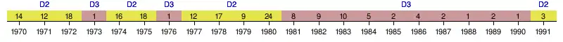 | 1970 | 2e | 14e | 38 | 42 | 13 | 12 | 17 | 37 | 49 | -12 | 32es de finale |