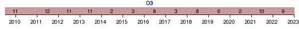 | 2021-2022 | 10e | 17 | 22 | 3 | 8 | 11 | 15 | 30 | -15 | 128es de finale | |
